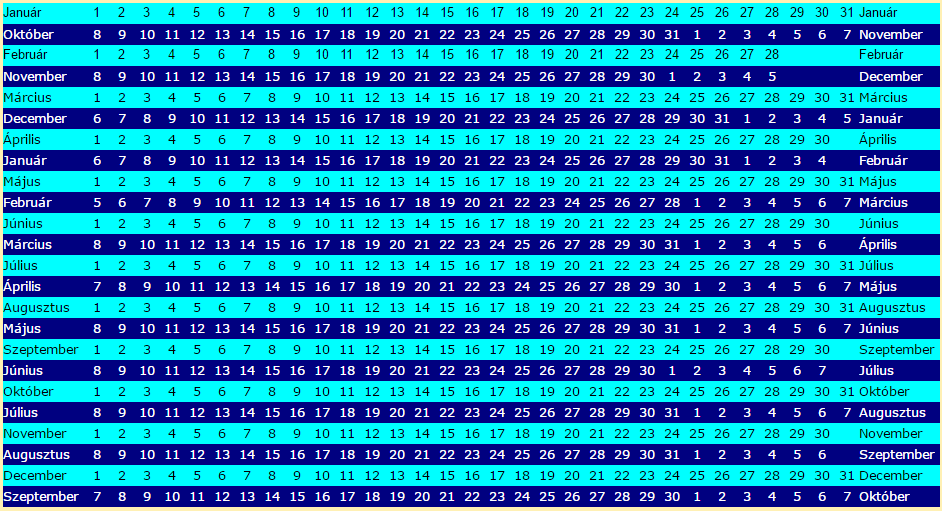 A világoskék sorokból válaszd ki az utolsó menstruációd első napját. Az alatta levő sötétkék sor megmutatja, mikor várható kb. a szülés időpontja.